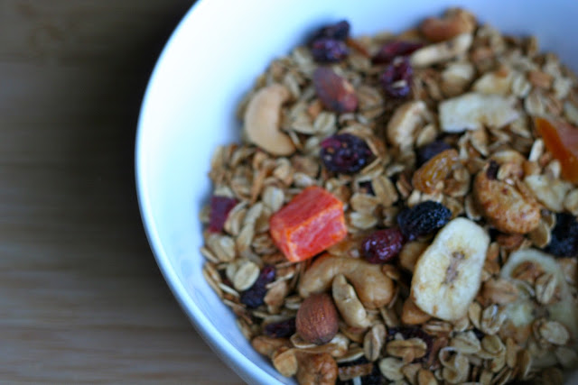 In a large bowl, mix oats, coconut, nuts, flaxseed and spices. Once combined, pour vegetable oil and agave nectar into the bowl to coat all the ingredients.