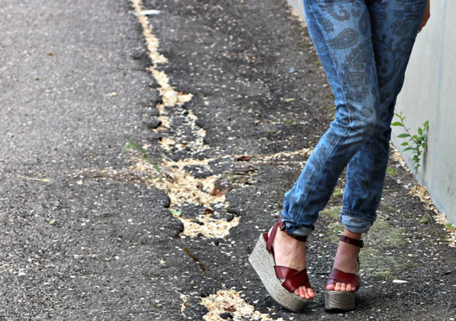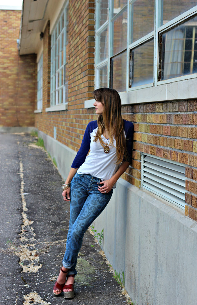 Love the print jeans; very unique without being over the top. Really like the pendant too. Pops perfectly off the white tee.
