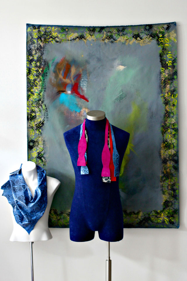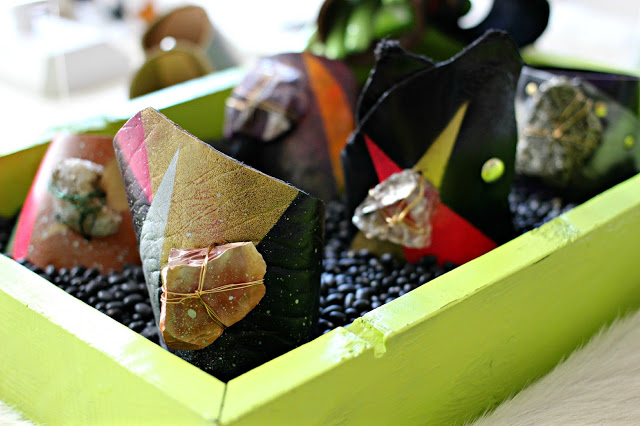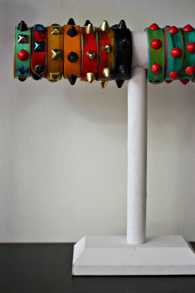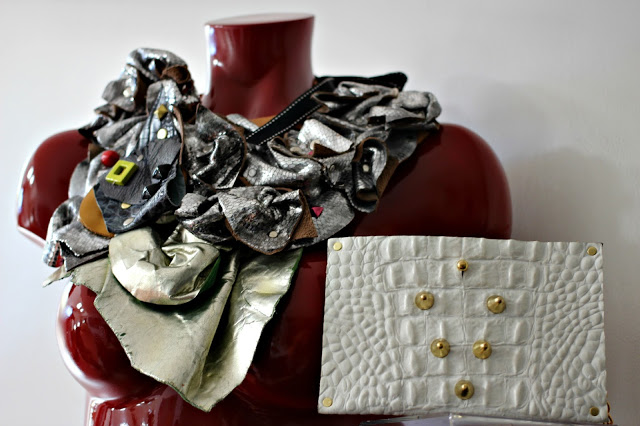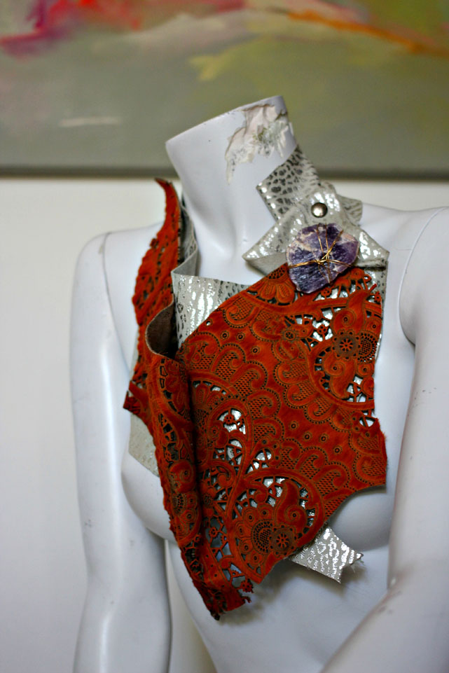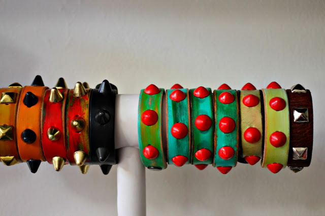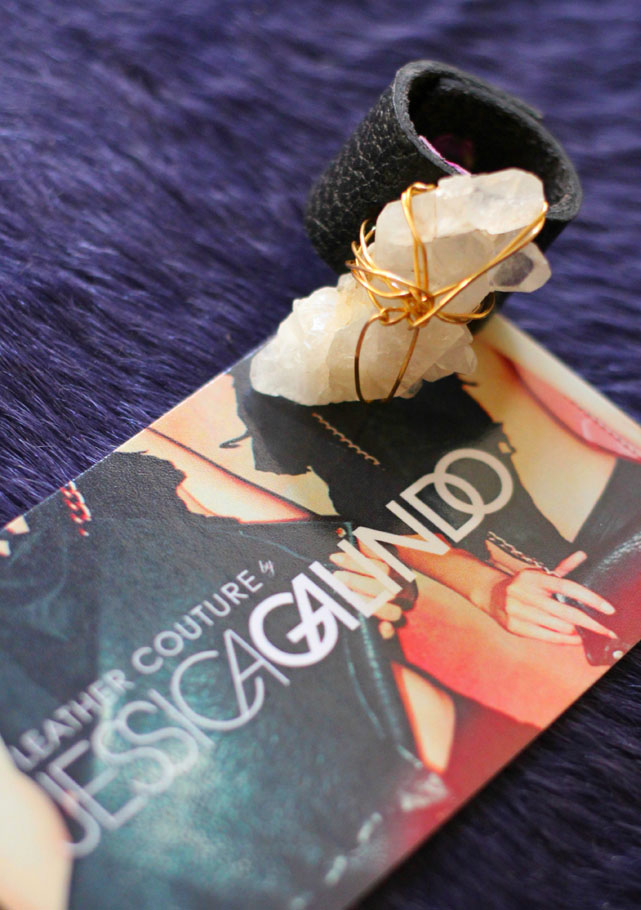 While in Vegas, I had the pleasure of meeting Jessica Galindo, the designer and artist behind Leather Couture. Jessica’s showroom is one to envy, filled with an eclectic mix of original artwork, vintage furnishings and pieces on display from her line of leather accessories. The collection is edgy, bursting with color and creativity. Each piece is fashioned with high quality leather, decorated with studs or detailed with a bit of paint. The originality is intoxicating, in the best way imaginable.