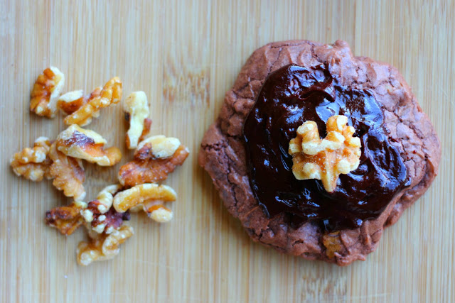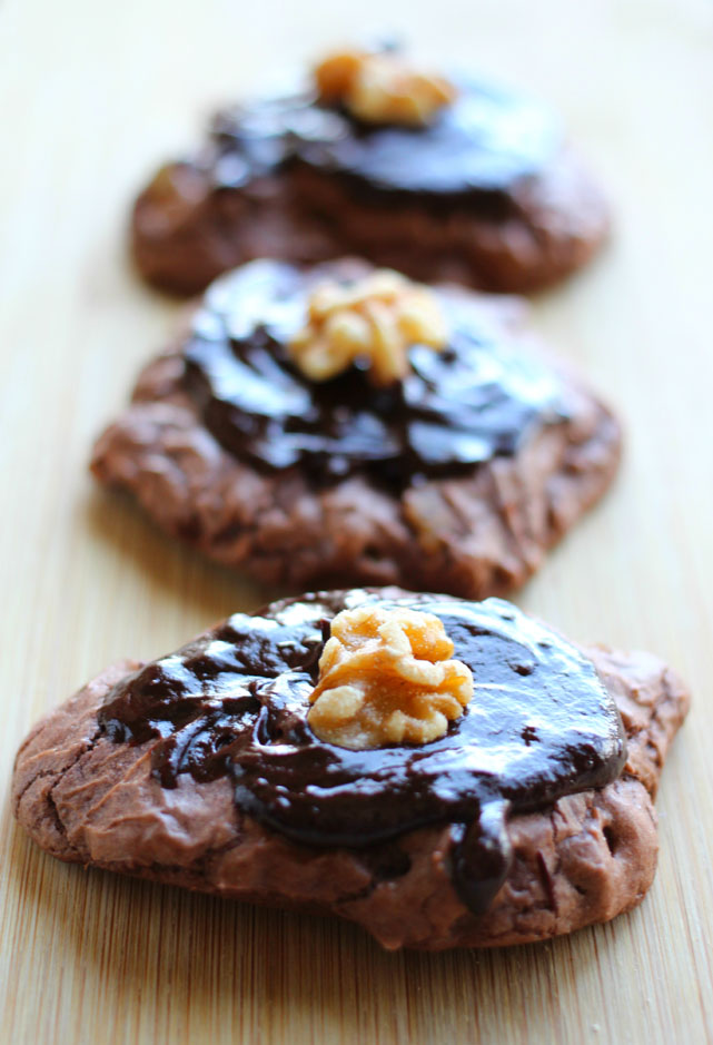 As you may have noticed (here and here), we’re pretty big fans of the brownie-walnut combo, especially when it’s served with extra chocolate sauce. It’s a treat we never fail to pass up, and this version sure hits the spot. To make our dessert extra special, I added one cup of chopped walnuts to the cookie batter and then smeared the top of each baked cookie with my go-to chocolate sauce. Match made in heaven, my friends.