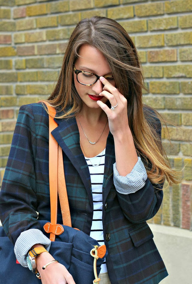 With the change in season, it’s only fitting that I’m falling for plaid. The Scottish tartan pattern has me smitten. I prefer the blue, green and black combination because it is classic and traditional. It’s been around for years, and it’s definitely here to stay. This plaid pairs perfectly with stripes, a ‘Russian Red’ lip and oversized specs. What’s not to love?