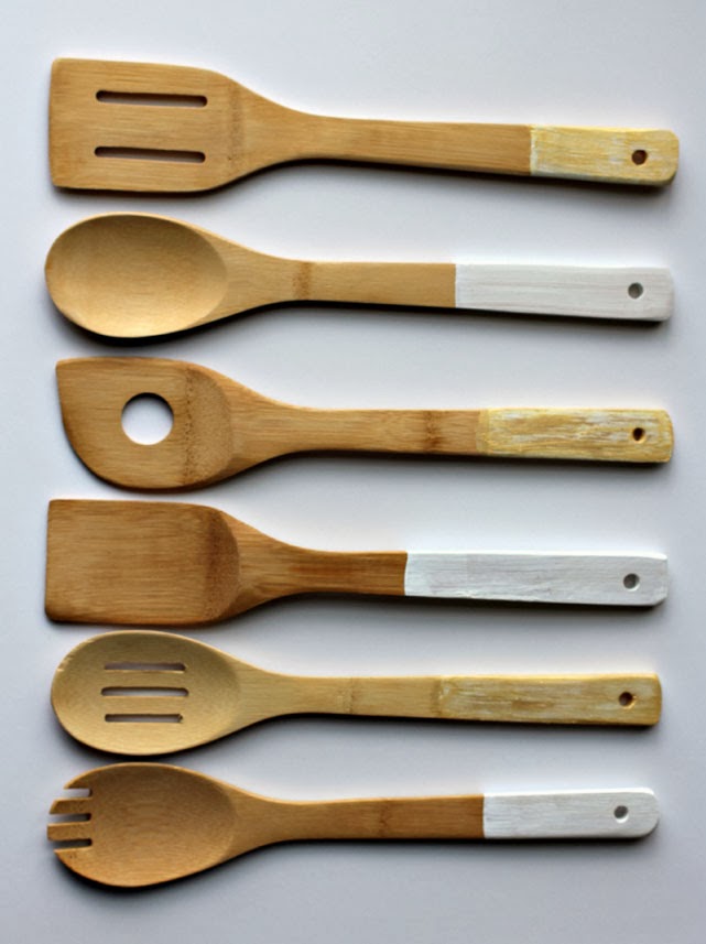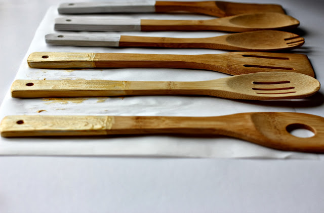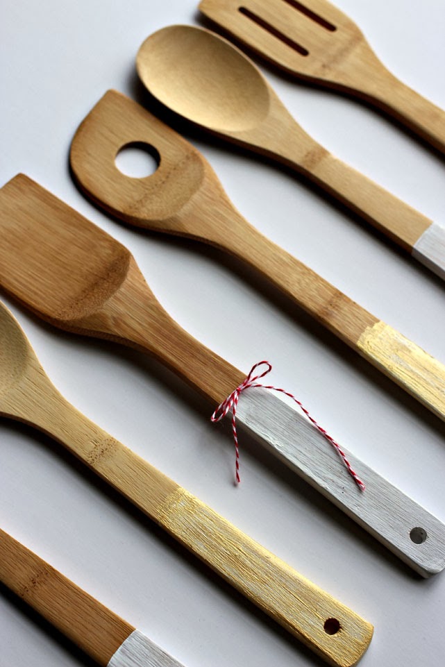 The beauty of this little project is that it doesn’t have to be perfect. The flaws, uneven lines and amateur paint job add character. Cut a sheet of parchment paper to fit all of your serving pieces. This is where you’ll set them to dry in between coats of paint. Begin by painting a thin coat of paint to each piece, either alternating heights or painting to a consistent level. Make sure to paint the front and sides only, leaving the back to paint once the first coat on the front has dried. This allows for time to dry on either side. Add additional coats of paint until your pieces look the way you like. I did two coats of white on each piece and an additional coat of gold on three of the six. Tied with baker’s twine and paired with a collection of recipes, these pieces would make the perfect gift.