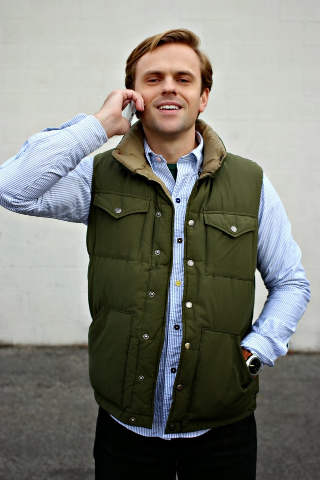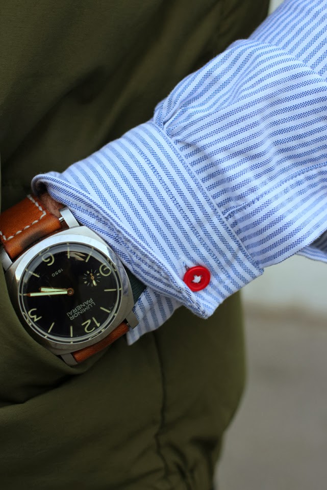 After sewing a statement button onto my favorite button-down shirt (and purposely matching it with my new WP specs), I started on his. Jake’s striped Oxford now has multi-colored, contrasting buttons. Both the cuffs are buttoned in bright red, and there is a pink, navy, maroon, yellow, brown and black button sewn down the placket. I’m quite pleased with the way things turned out–these little buttons really do pop.