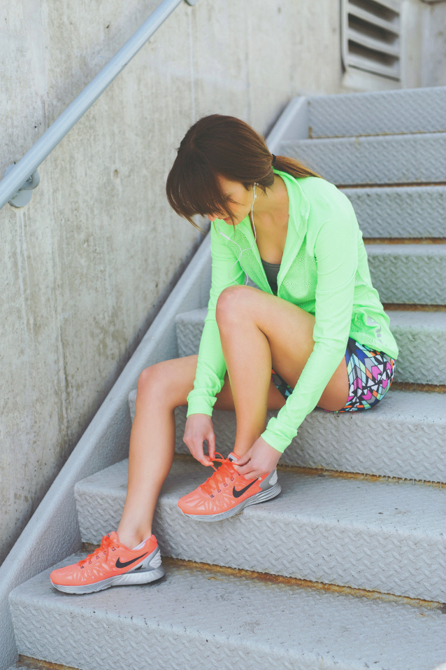 Nike Shape 2.0 sports bra c/o (similar at lower price), FILA geometric compression shorts + black sport shorts, printed jacket (similar by Nike), neon jacket (similar by Zella), Nike Lunar Glide runners (similar here + here)