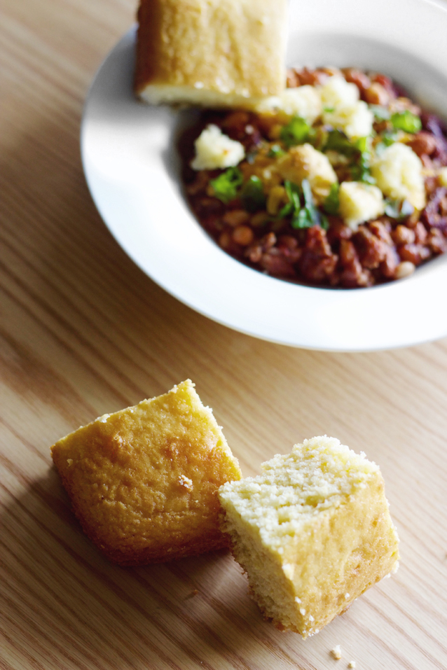 I like to serve this chili topped with cheese, torn purple basil and crumbles of cornbread.