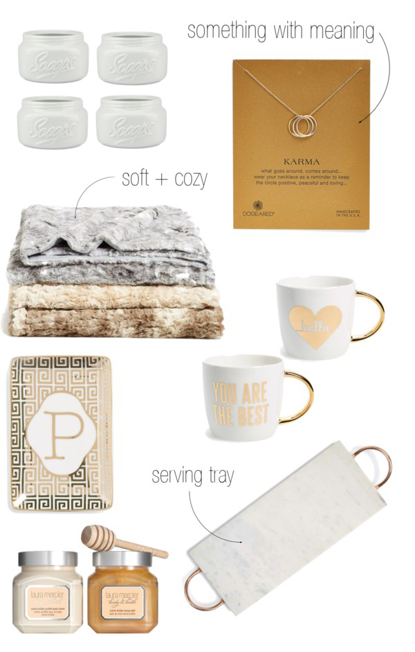 Instead of showing up empty handed, I like to bring a little something to gift the host. Pretty things like bubble bath, dessert bowls or gilded serving trays tend to do the trick.