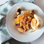 To serve, the cobbler is best while piping hot with vanilla ice cream and an additional sprinkle of cinnamon.