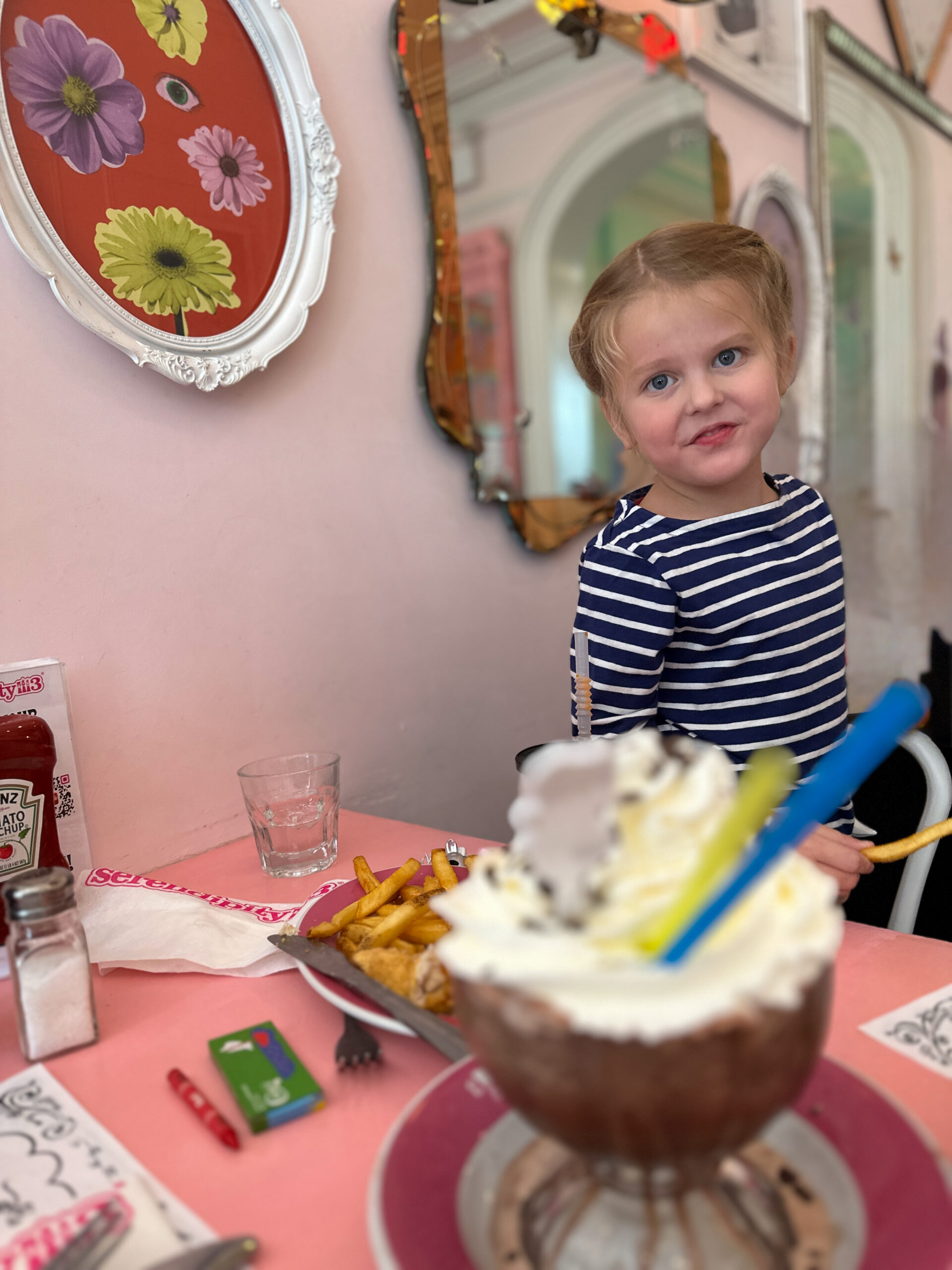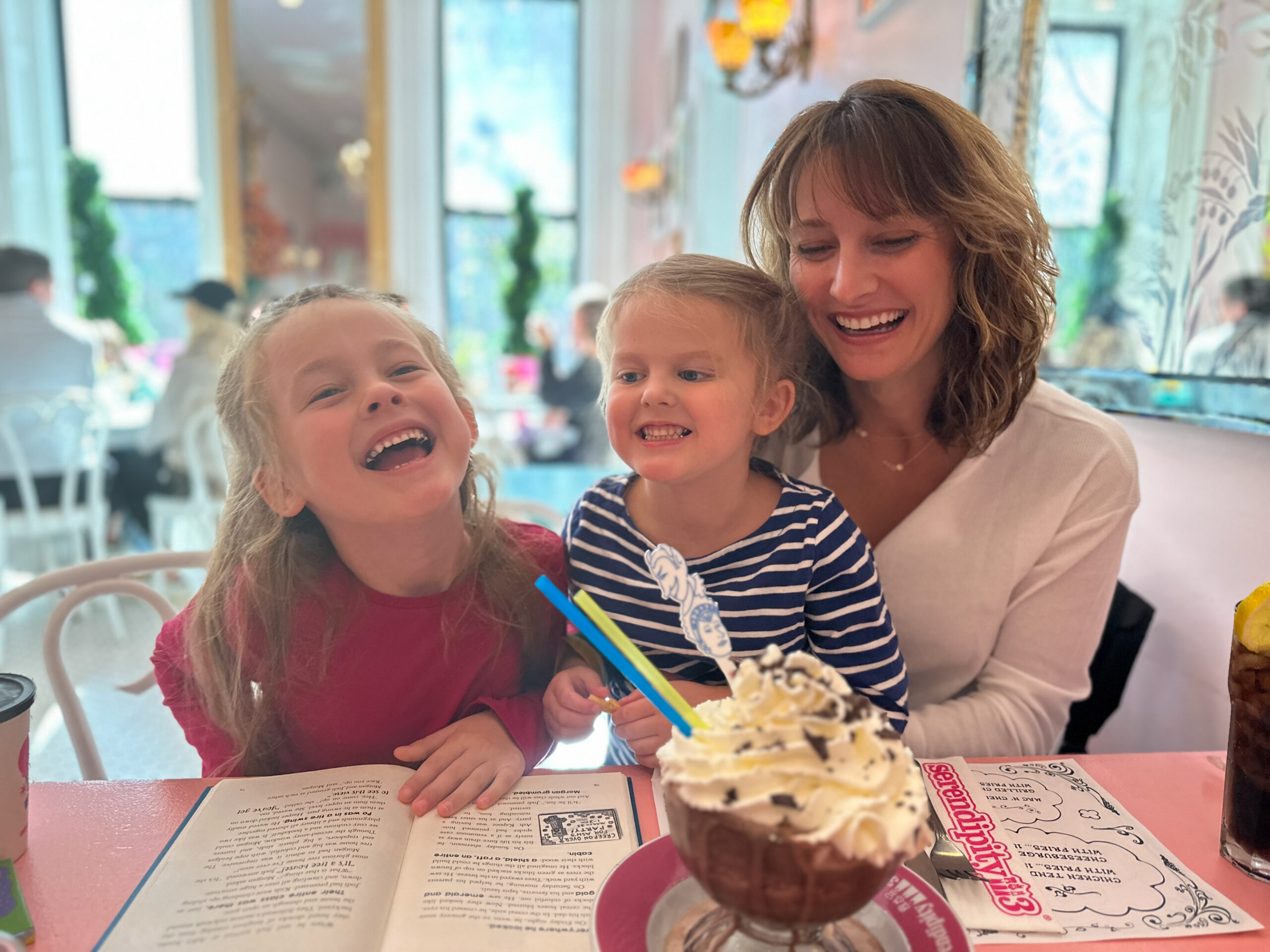 It shouldn’t come as a surprise that Serendipity 3 is popular among locals and tourists alike. I highly recommend making a reservation online. There are two locations–the original in UES and a new space in Times Square. Seating on the second floor of the UES location is bright, airy and features colorful seasonal decor. Combined with the many shades of pink, it’s the very best seat in the house. My girls loved it.